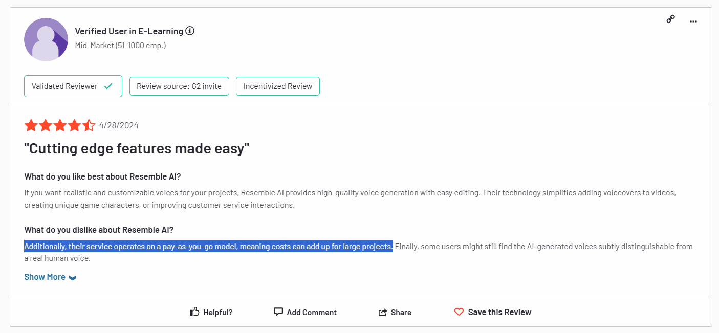 Last but not least, verified users of the platform are not satisfied with Resemble AI’s pricing model and note that costs can add up for large projects.