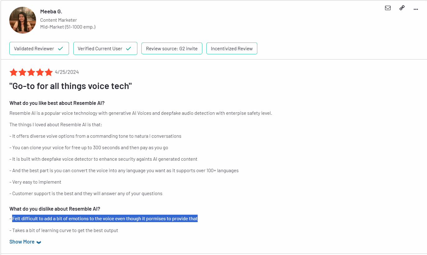 ‘’Felt difficult to add a bit of emotions to the voice even though it promises to provide that.’’ – G2 Review.