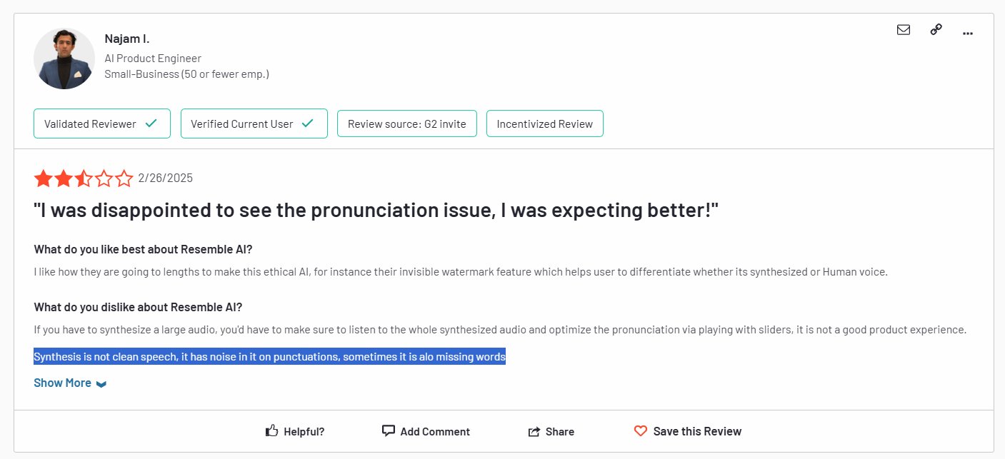 ‘’Synthesis is not clean speech, it has noise in it on punctuations, sometimes it is also missing words.’’ – G2 Review.