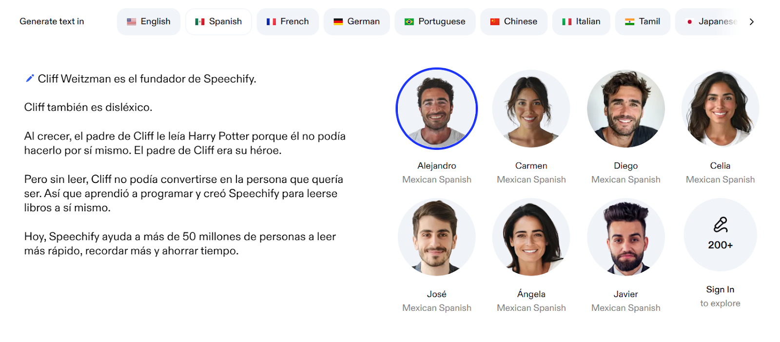 Speechify offers a text-to-speech solution that helps content creators turn written content into human-like audio using over 200 natural voices in 60+ languages.