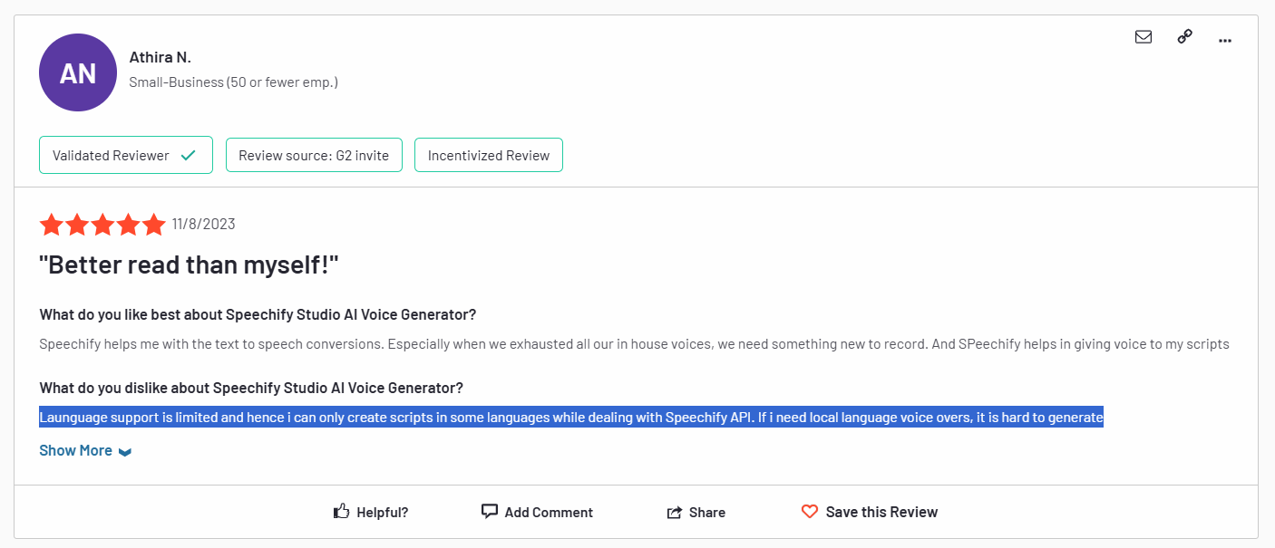 ‘’Language support is limited, and hence I can only create scripts in some languages while dealing with the Speechify API. If I need local language voice-overs, it is hard to generate.’’ – G2 Review.