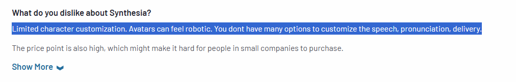 ‘’Limited character customization. Avatars can feel robotic. You don't have many options to customize the speech, pronunciation, and delivery.’’ – G2 Review.