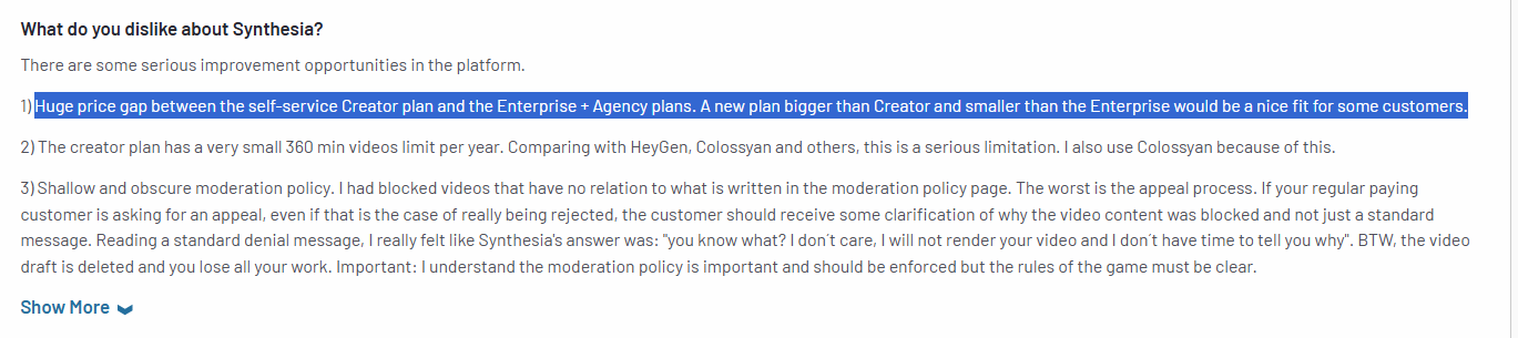 Another recurring complaint was about the big price gap between Synthesia’s paid plans, which left medium-sized enterprises wondering what they could do about it.