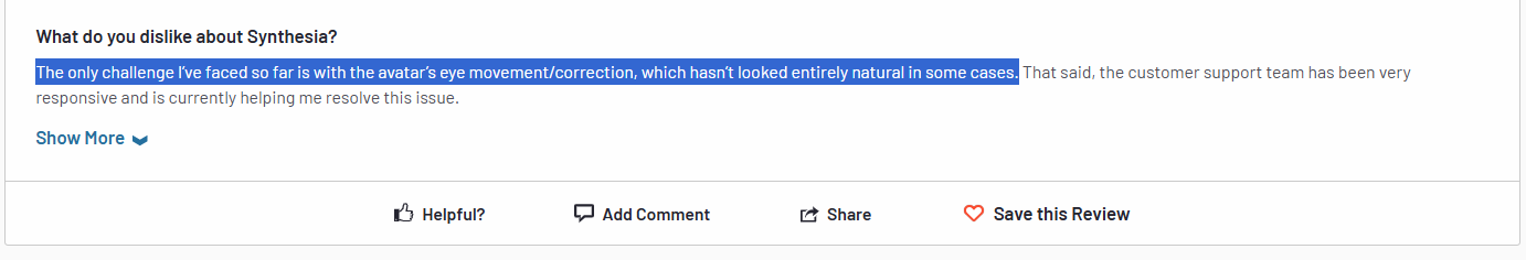 Last but not least, customers of Synthesia are not happy with how unnatural some of the avatars look, especially their eye movements and corrections.