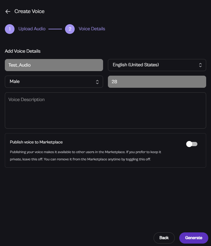 Enter the Name, Language, Gender, Age, and Description. If you want to publish this voice to the Marketplace, enable the toggle button; otherwise, leave it off and click 'Generate' to create a new Text-to-Voice synthesis.