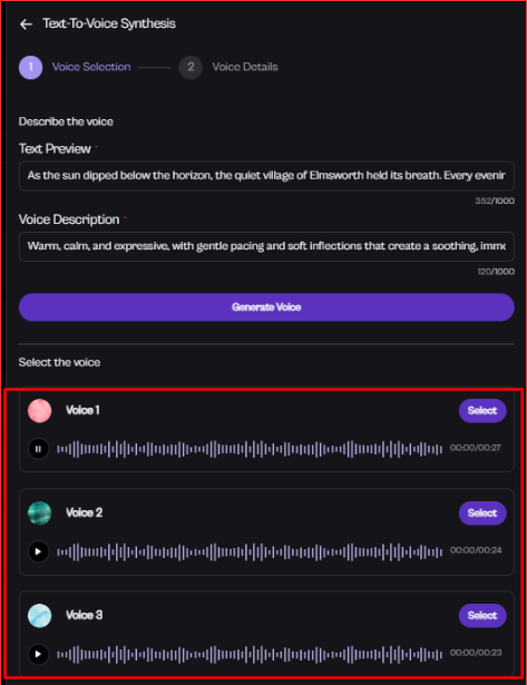 Once you click on “Generate Voice”, it will give you three different voices based on your voice description.