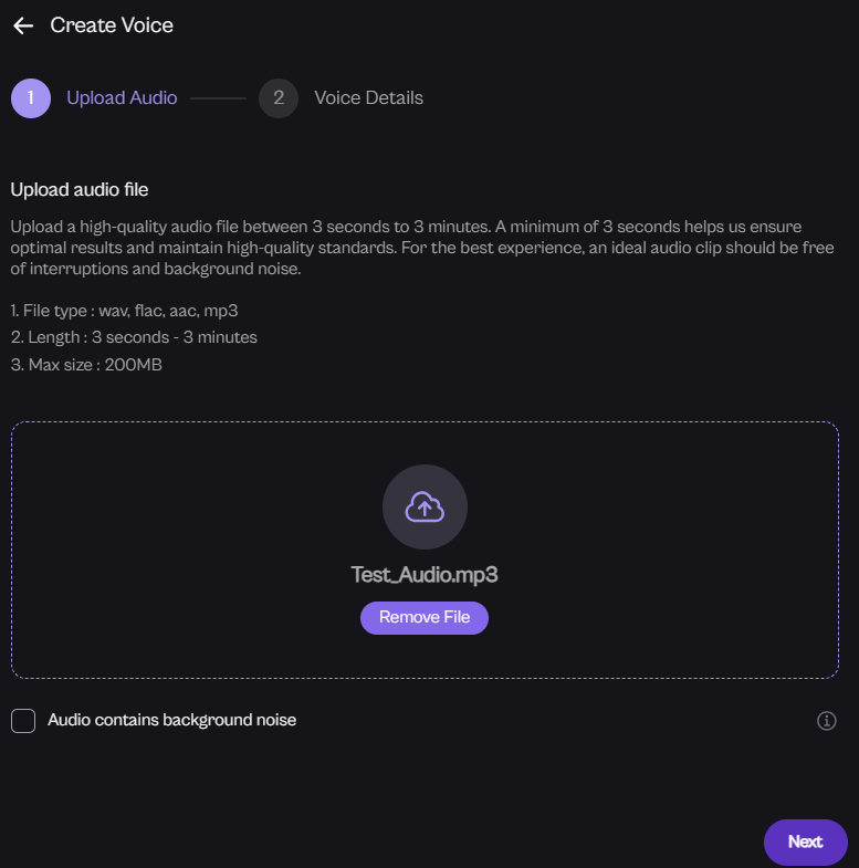 To achieve the best results, upload a high-quality audio file that is clear and free from interruptions or background noise. A minimum 90 seconds is the suggested duration to ensure we can process the voice effectively.
