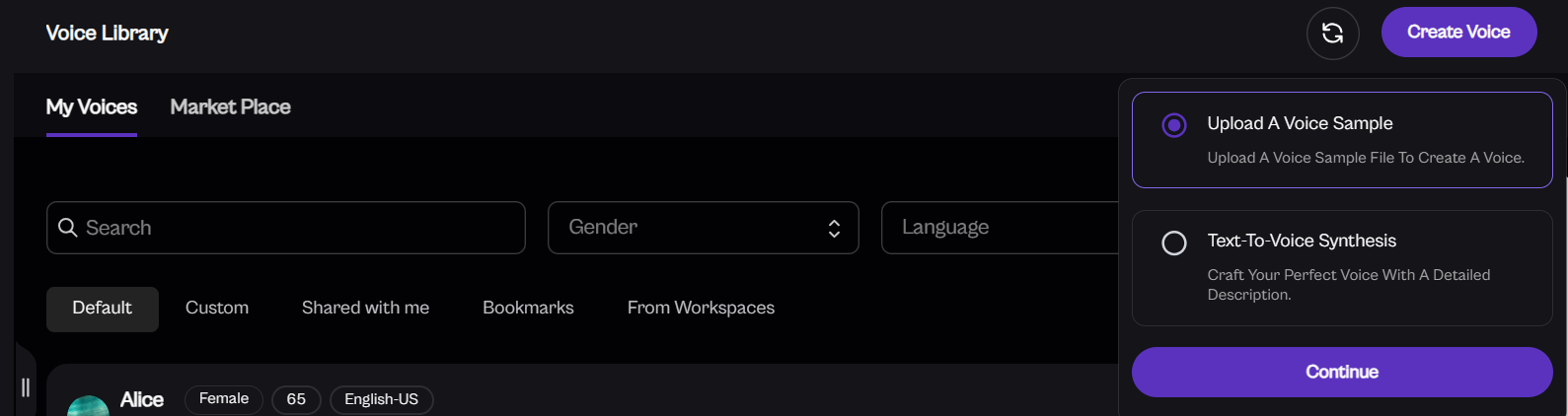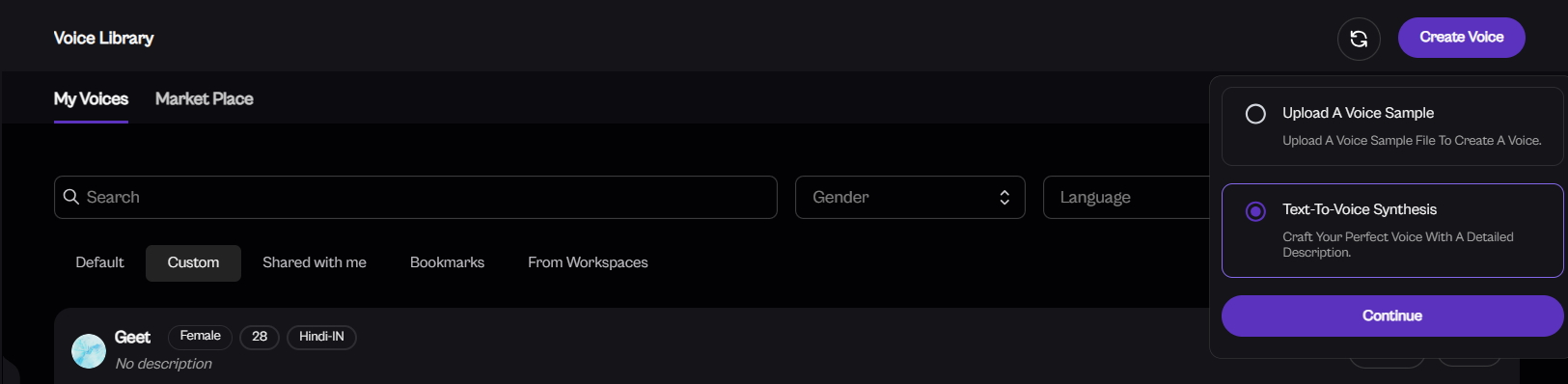 Once you've added the details, the system will process the voice, and it will be saved to your Custom Voices section in your Voice Library.