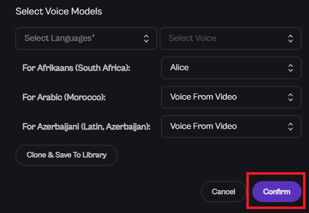 Once you’ve selected your voice(s), click Confirm to save your choices. This will ensure that the correct voice is assigned to your dubbing project, whether for one language or multiple.