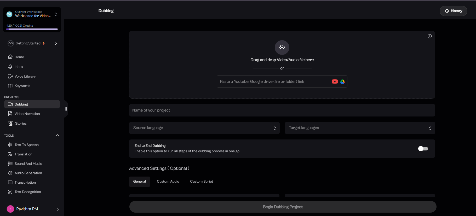 Go to the Home page and select "Dubbing" or choose the "Dubbing" option from the left panel under Projects.
