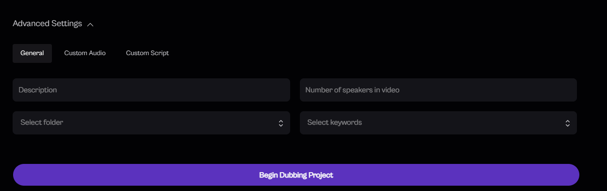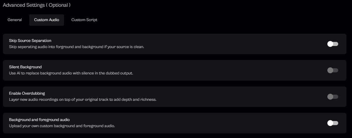 Note: Each toggle enables a specific audio customization mode. You can enable one or multiple depending on your dubbing needs.