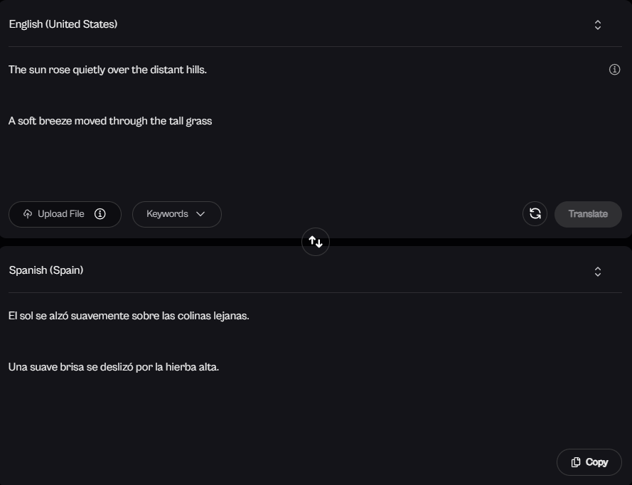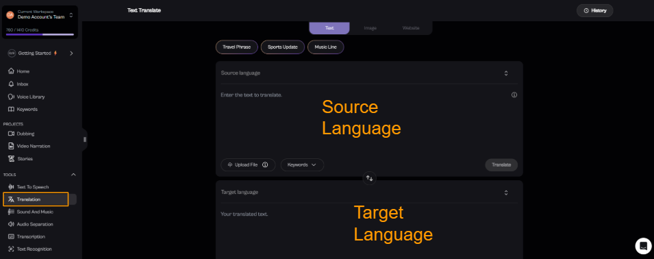 Note: To try 'Text Translate', just click a sample text above like 'A Short Story' or 'Social Media Post', then click 'Translate'.