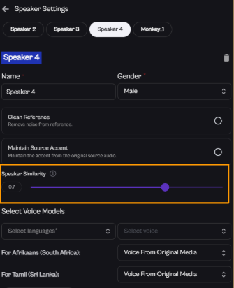Speaker Similarity controls how closely the generated voice matches the original speaker’s voice from the reference audio. It helps maintain the same voice identity when audio is generated, translated, or dubbed into another language.