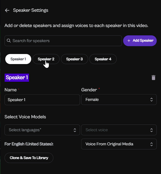 When you choose Clone & Save to Library for a particular speaker, the cloned voice is saved to your Voice Library, where you can name it and reuse it anytime.