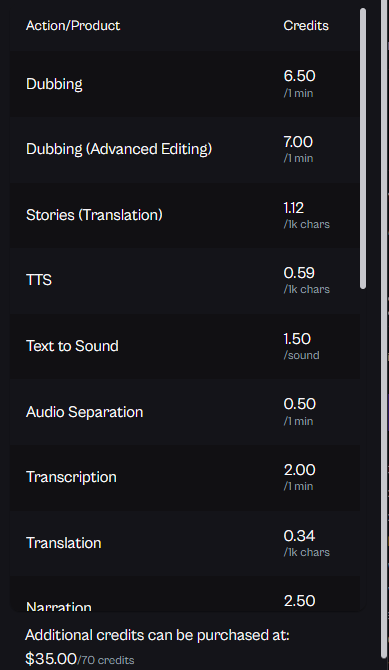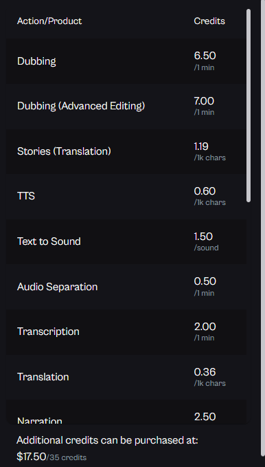 The Free Plan is perfect for those just getting started. It allows users to explore basic features without any financial commitment. Upon choosing this plan, you will get 21 credits, which will allow you to dub approximately 3 minutes. You can access TTS as well. Here is a list of the different options and its costs.