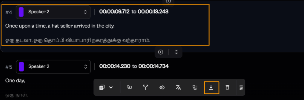 To download a single dialogue, first select the dialogue you want to export. Once selected, a floating toolbar appears below the dialogue, as shown in the screenshot.