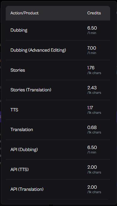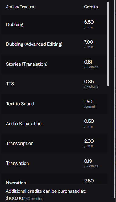The Free Plan is perfect for those just getting started. It allows users to explore basic features without any financial commitment. Upon choosing this plan, you will get 21 credits, which will allow you to dub approximately 3 minutes. You can access TTS as well. Here is a list of the different options and its costs.